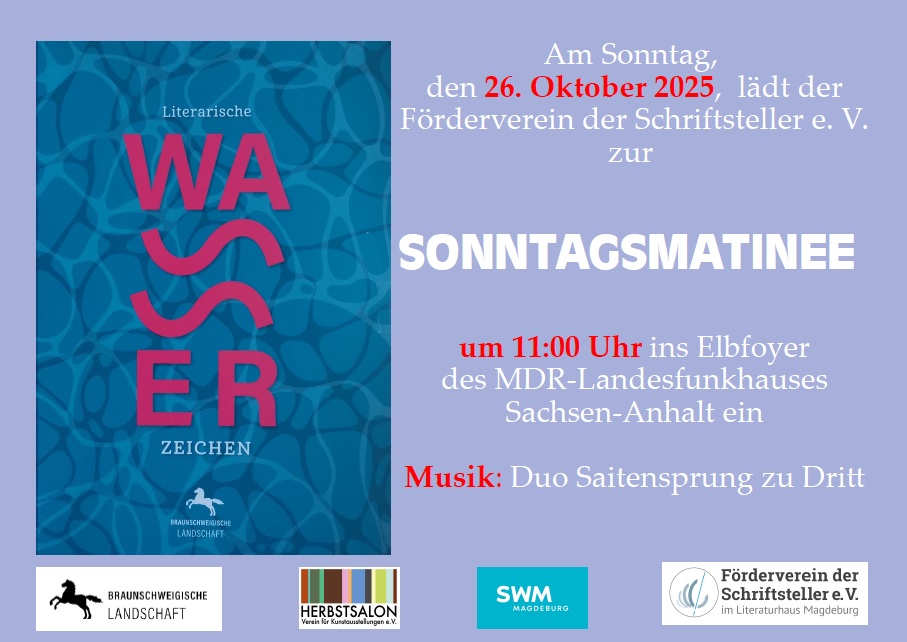 26. Oktober 2025, 11 Uhr im MDR-Landesfunkhaus, Magdeburg Matinee anlässlich der Ausstellung "Wasser" des Kunstvereins Herbstsalon e.V. Es lesen: Herbert Beesten, Kirsten Döbler, Dorothea Richter, Helga Thiele-Messow, Ulrich Wittstock. Flyer